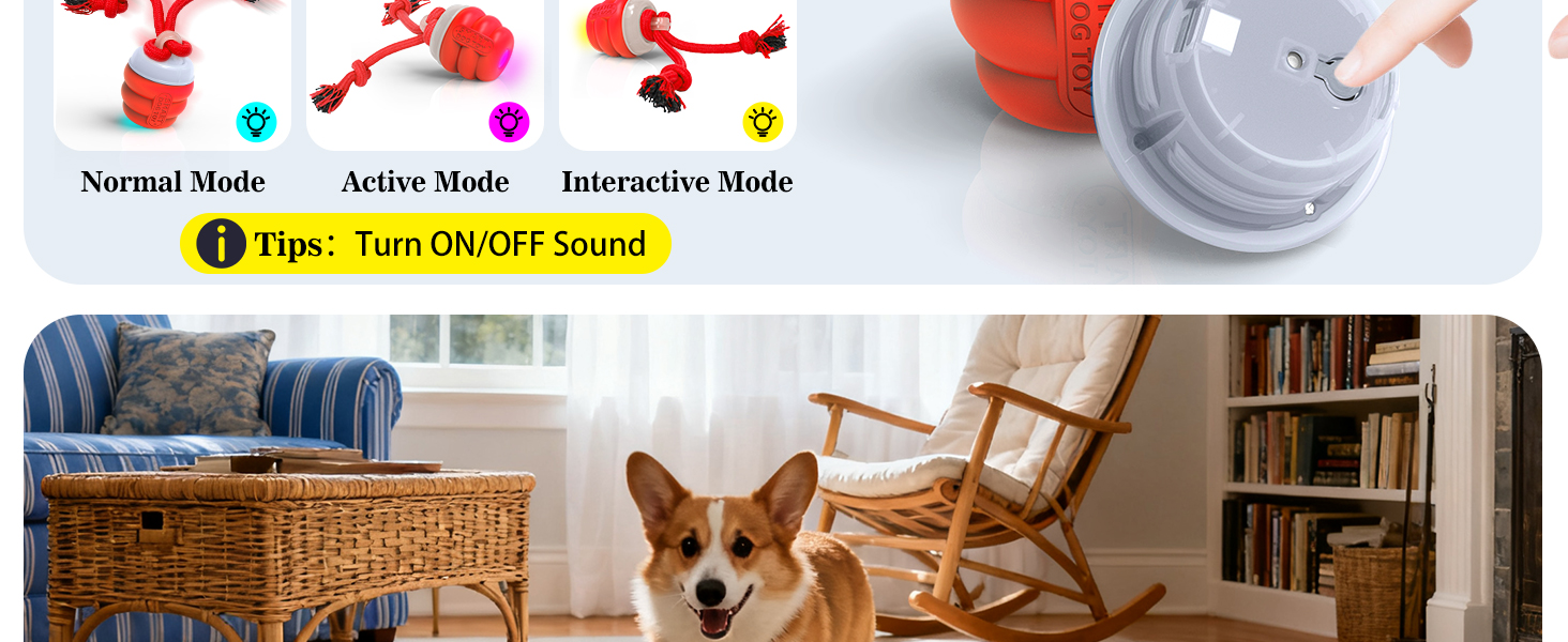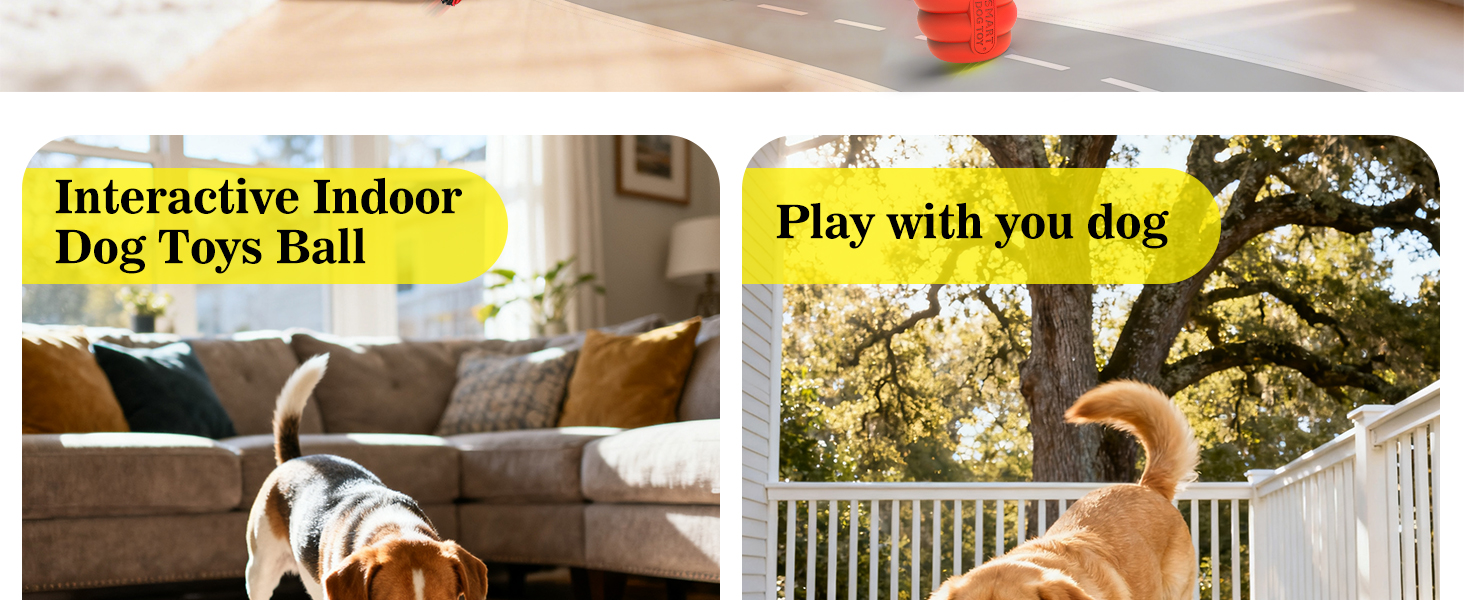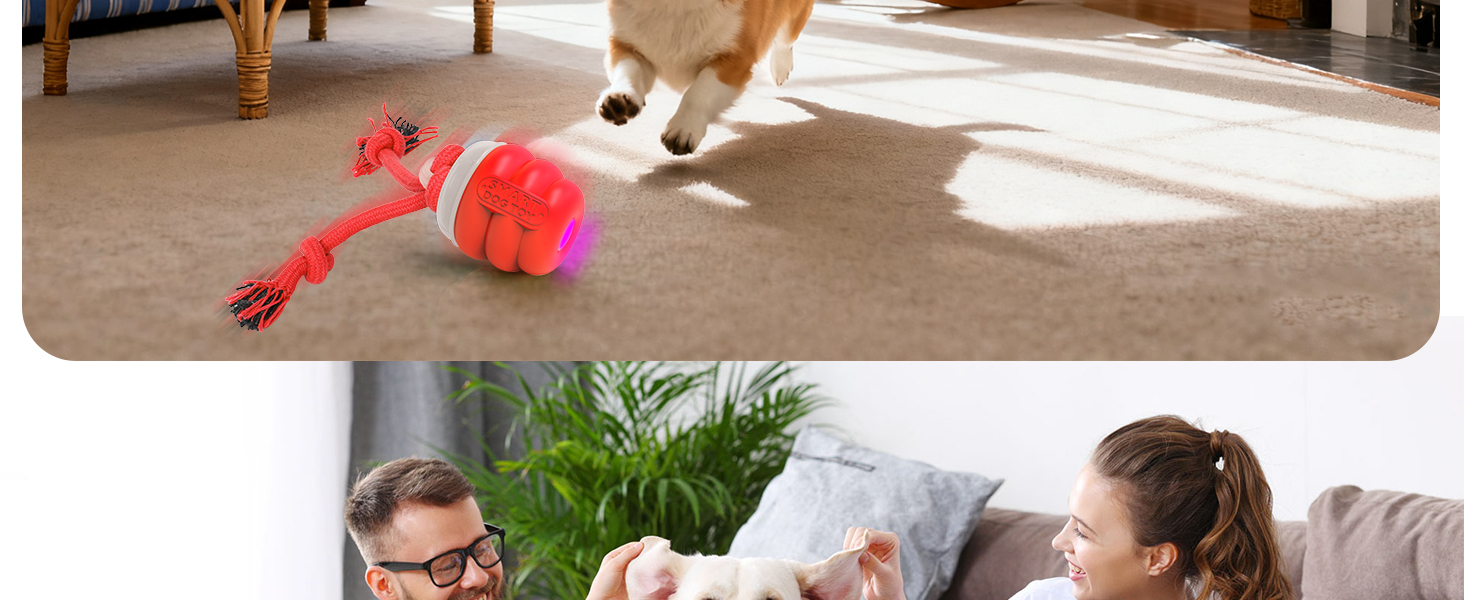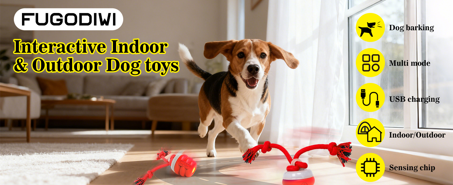- Interactive dog toys to keep them busy: FUGODIWI interactive dog ball comes with a string that moves along with it, and the irregular movement of the toy attracts the dog to chase it, with realistic barking sound providing mental stimulation and endless fun.Barking sounds default on, but you could turn it off by quickly press the button twice when you need quiet