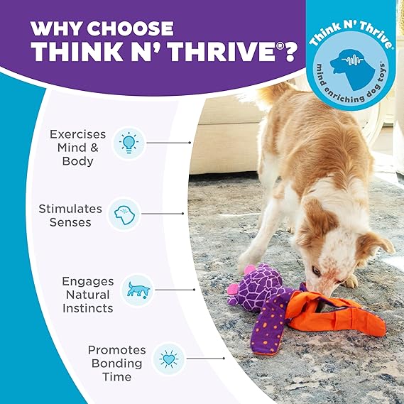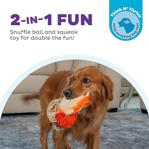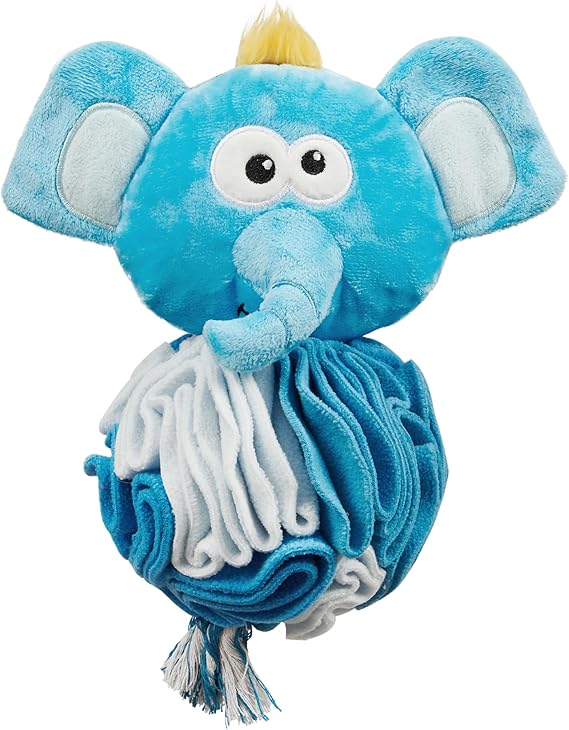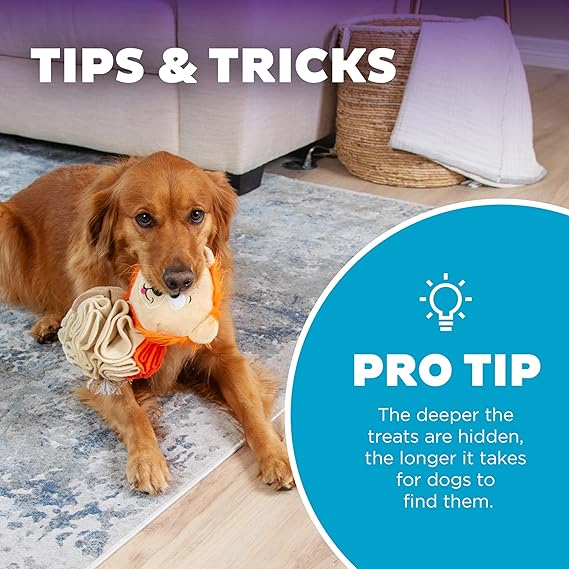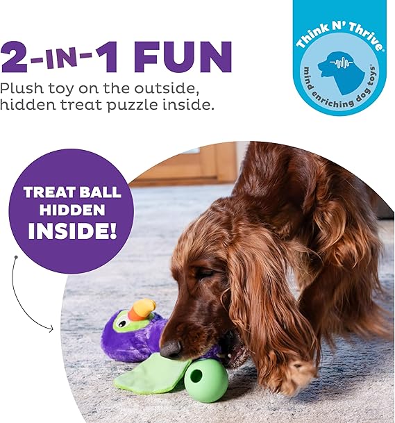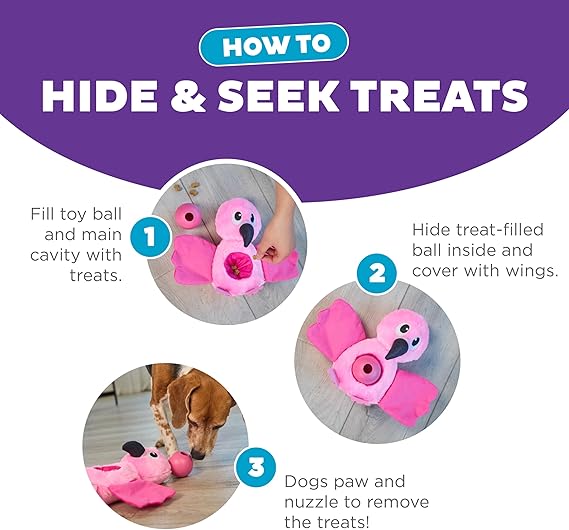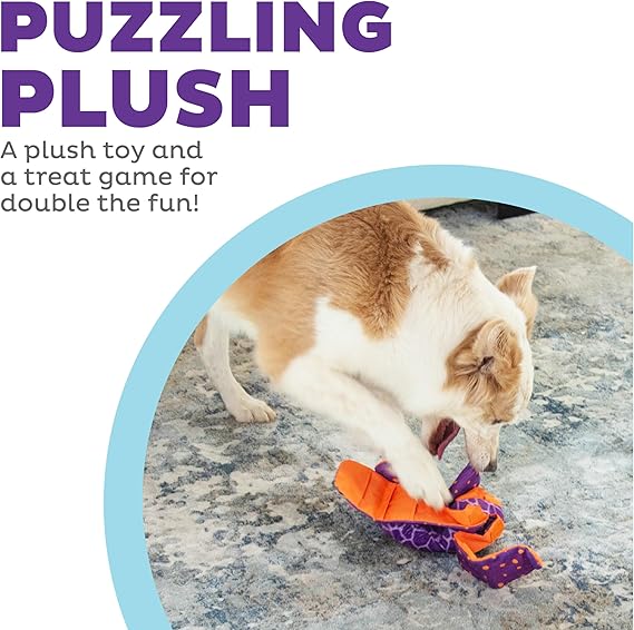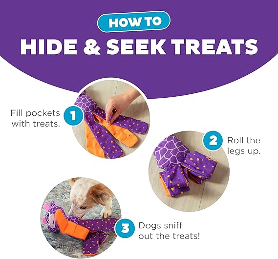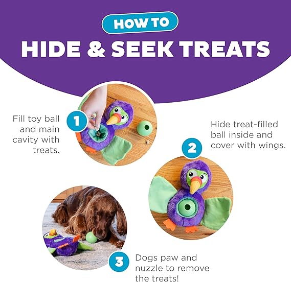 Nina Ottosson by Outward Hound Hide-Ablez dog puzzle combines a plush dog toy with a treat dispenser ball for brain-teasing fun your dog can't resist! Load the treat ball with treats, conceal it within the plush toy, and let your dog unleash their problem-solving skills. They'll use their paws and nose to retrieve the ball and secure the tasty rewards. Even after the treats are gone, the crinkle and squeaky dog toy sounds maintain your dog's interest and prolong the fun. Outward Hound Think N' Thrive mind enriching dog toys give treat-loving dogs a more fulfilling playtime that is mentally stimulating, physically engaging, and emotionally rewarding. Our toys allow dogs to act on their natural behaviors and use their minds, senses, and instincts to problem-solve and actively relieve stress while they play. Engage your dog's foraging and hunting instincts, promote mental enrichment, and ensure endless entertainment with the Nina Ottosson by Outward Hound Hide-Ablez plush dog puzzle. SAFETY & CARE: When choosing a plush puzzle/treat toy, make sure to choose an appropriate size/style toy for your dog. No toy is indestructible. ALWAYS supervise your dog closely, teach your dog how the toy works. This is not a chew toy and not recommended for dogs that chew heavily. Inspect regularly for damage and remove if broken, or if parts become separated, as serious injury may result. Intended for dogs only. Keep out of reach of children. Ultimately, your pet's safety is your responsibility.