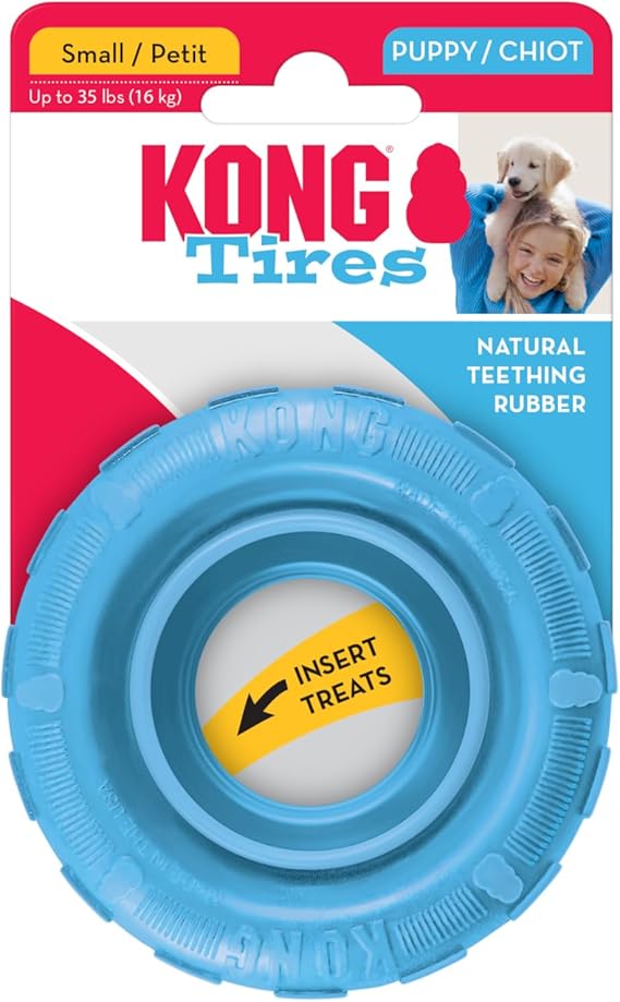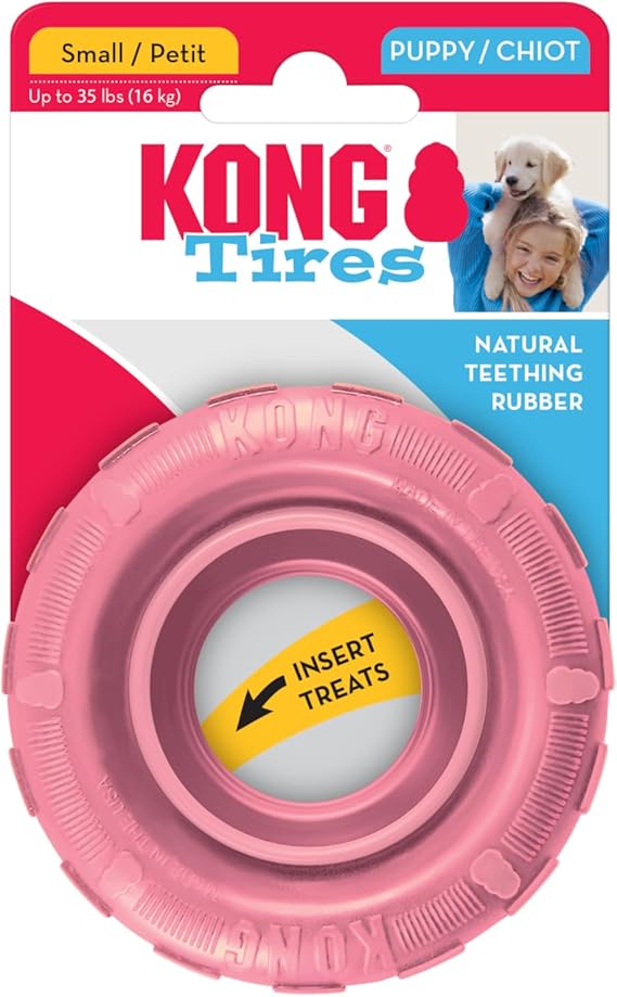KONG Puppy Tires - Dog Chew Toy for Puppies - Stuffable Dog Toy for Treats & Snacks - Natural Rubber Chew Toy for Teething Puppy - for Small Puppies - Randomly Provided Color