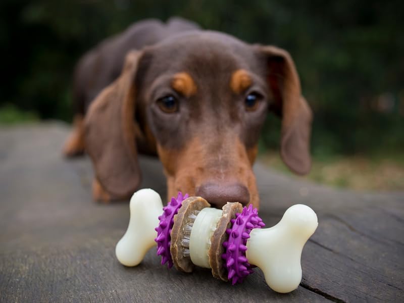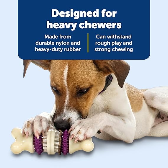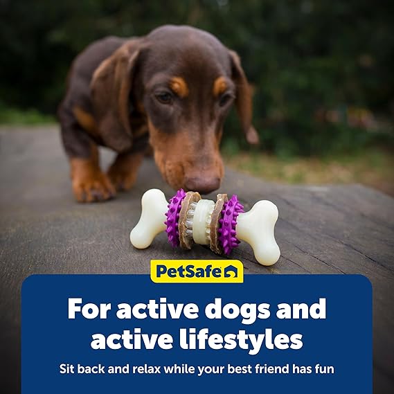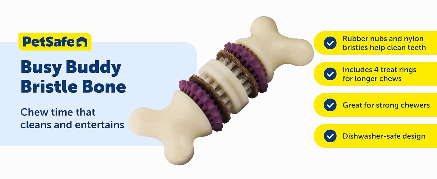 Let your dog brush his own teeth while hes having a blast playing with the PetSafe Busy Buddy Bristle Bone. It has 3 chewing surfaces and a treat ring for your pup to chew on. The rubber nubs and nylon bristles help stimulate gums and keep teeth clean. This toy also includes 4 Busy Buddy treat ring refills (additional treat ring refills available separately). Designed for tough chewers, this fun toy is made from durable nylon and heavy-duty rubber. Its easy to clean and top-shelf dishwasher safe. Choose from extra small, small, medium and large sizes. For dogs over 6 months old. PetSafe brand is here to help you and your pet LIVE HAPPY TOGETHER.