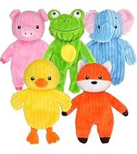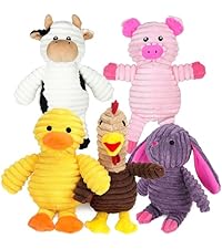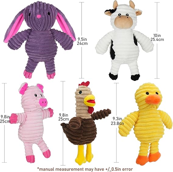 - PLUSH DOG TOY SET: Our 5pc cute dog toy assortment includes a yellow duck dog toy, a pink pig dog toy, a purple rabbit/bunny dog toy, a brown rooster/chicken dog toy, a white cow dog toy