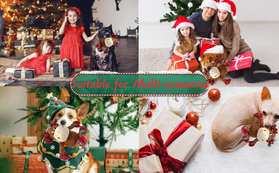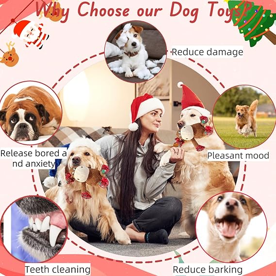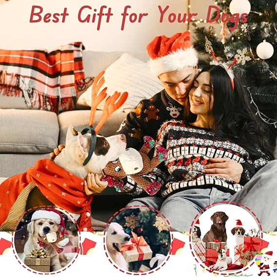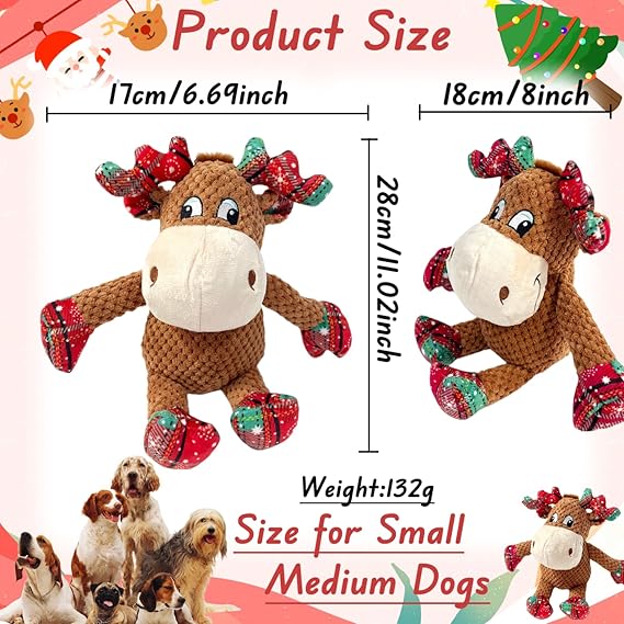 - [Deer Dog Toys with Santa Hat] These adorable deer-shaped dog toys with Santa hats in brown and red colors will captivate your dog's interest and keep them entertained. Made with premium plush material, they are soft, lightweight, and perfect for tug and fetch games. Easy for pets to carry, toss, and roll around with, they are great gifts for puppies, small, medium, and large dogs.