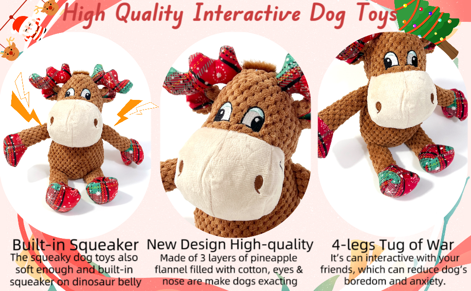 - [Squeaky with Crinkle & Dog Toys] These deer-shaped interactive dog toys have built-in squeakers that stimulate your pet's passion by making sounds when pressed. With built-in crinkle in the ear, they are great toys to interact with your dog, help them get more exercise, and reduce anxiety and boredom.