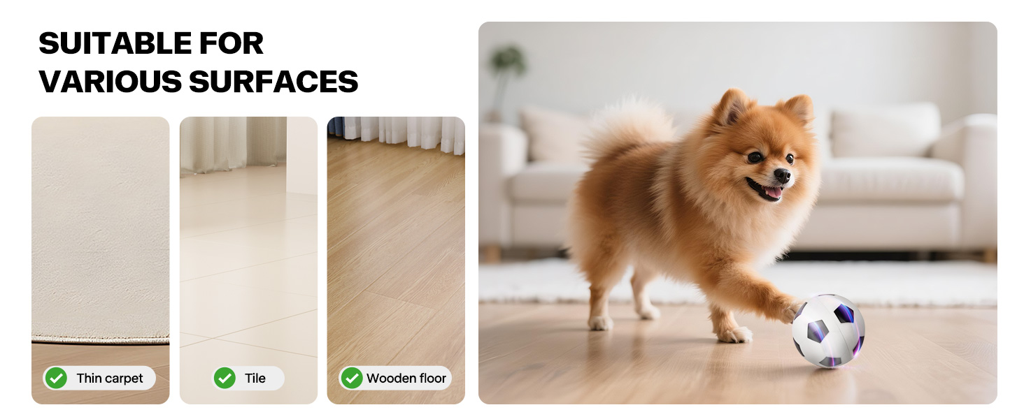 - Easy to Clean: IP 54 waterproof,designed for both indoor and outdoor use,this active rolling ball for dogs can be easily cleaned under water. Its versatile use is perfect for various surfaces, including wooden floors, tiles, and thin carpets though it's best avoided on thick carpets