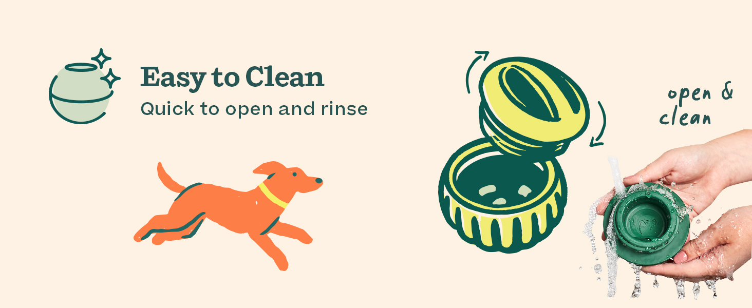- The No-Mess Dog Puzzle: The Pupsicle is a clean and easy dog treat toy! Designed with slots to capture drool during long licking sessions, it opens in the middle for easy filling and cleaning. Just unscrew the lid, insert pre-made healthy dog treats, and hand it to your eager pup!