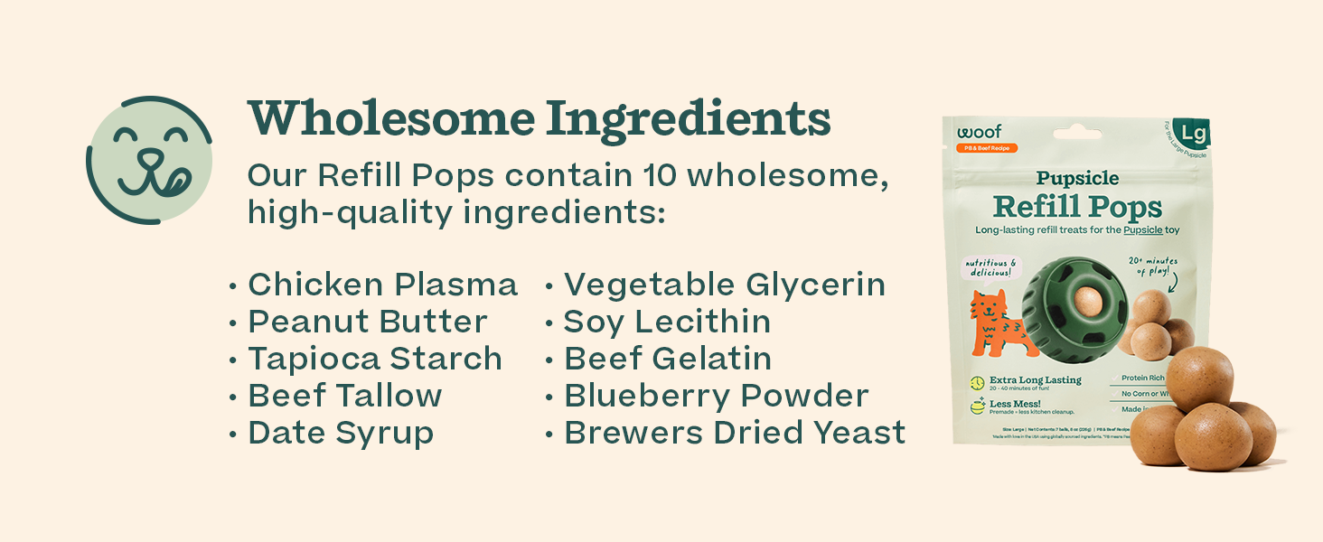 - Great Dog Chew Treats Use Great Ingredients: Pupsicle Refill Pops are delicious natural dog treats made with high-quality ingredients you can trust and pronounce. They include chicken plasma, peanut butter, tapioca starch, beef tallow, date syrup, glycerin, lecithin, gelatin, and blueberry powder.