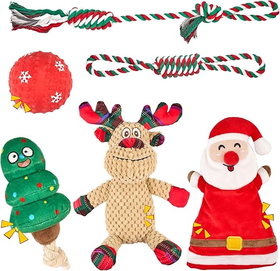 - 【Christmas-Themed Toy Set】The Arblina 6-piece dog toy set features various popular characters and playful designs to meet different needs. It includes two rope toys in different shapes, a reindeer, a Christmas tree, a Santa Claus, and a ball—all packed in a beautiful gift box, perfect for adding festive cheer to your decorations while keeping your dog entertained