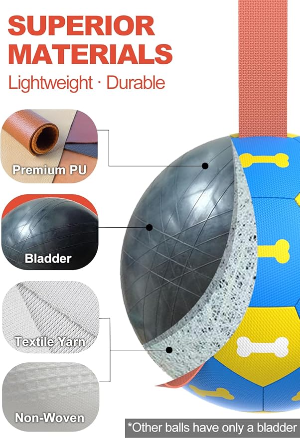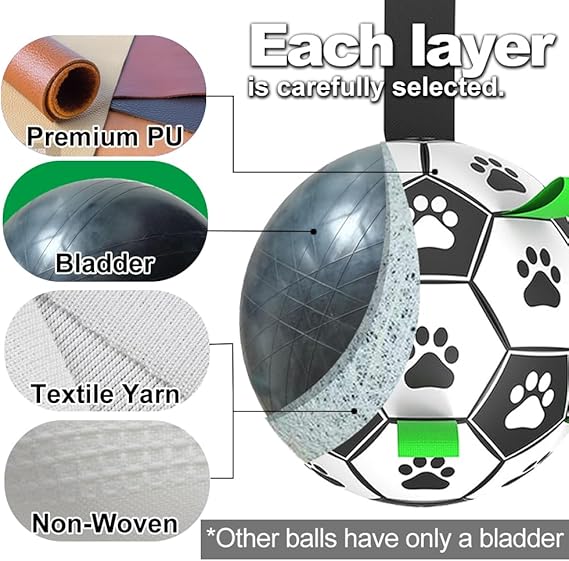 - [SAFE & TOUGH] The World Cup trend, safety level complying with children's toy standards, the dog ball is made of premium PU as same standard soccer ball. The straps of the ball body are very soft for the dog's teeth and nose jaws in the process of chasing and running. The football liner is made of pure cotton yarn rubber liner, and the protection is upgraded, safe and secure. This dog toys to keep them busy.