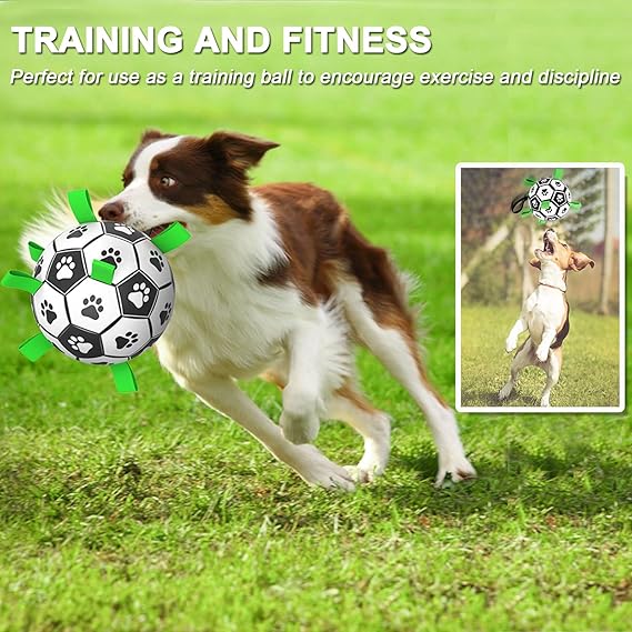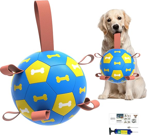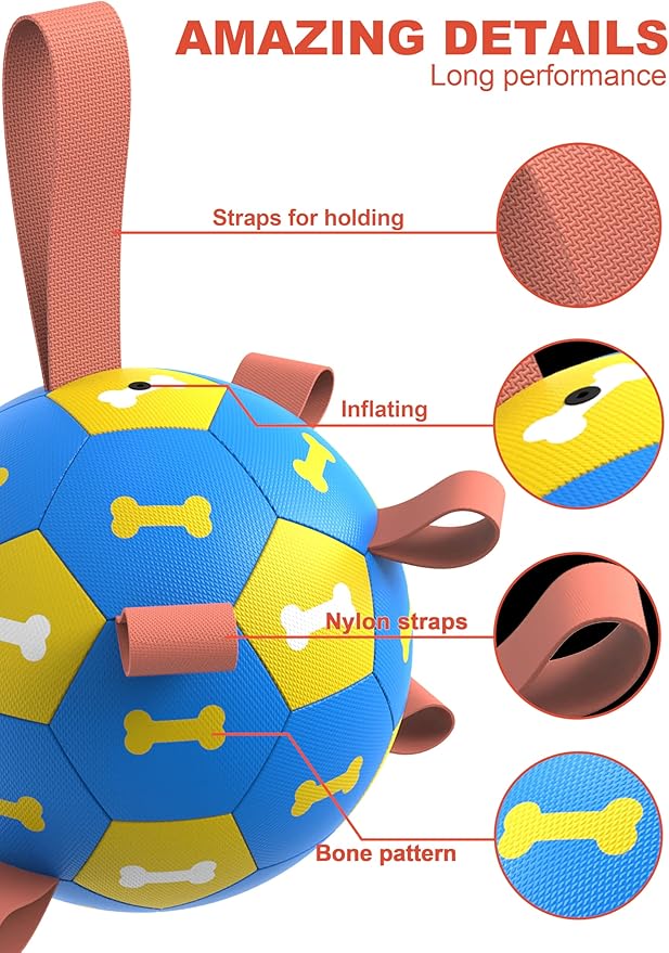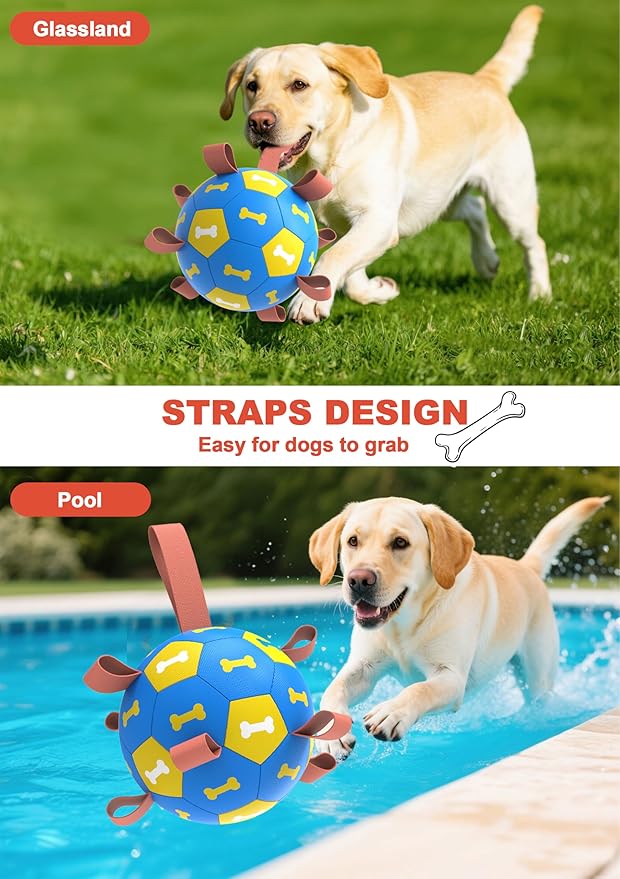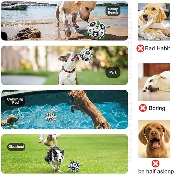 - [ULTRA BOUNCING BALL & WATERPROOF] Amasiver dog soccer features a lightweight buoyancy design, suitable for play in swimming pools, lakes, and beaches. The straps on the soccer ball are designed to keep your dog entertained, active, and promote interaction between humans and dogs.