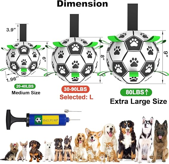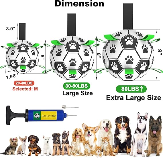 - [PUMP & NEEDLE ADAPTER INCLUDED] The soccer for dogs comes deflated. There's a needle point adapter and a pump inside package. The soccer ball dog toy is 8 inches in diameter, designed for dogs of all sizes and breeds from puppies in training to high energy dogs. But not for aggressive chewers.