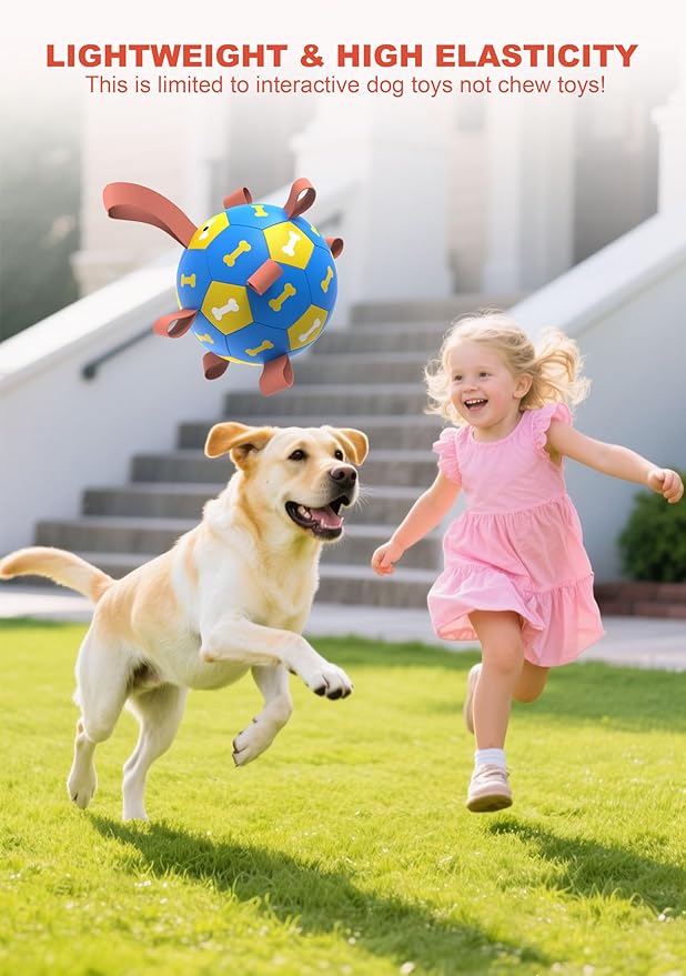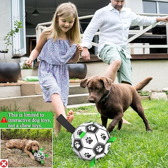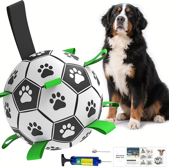 - [UPGRADE INTERACTIVE SOCCER BALL] Nine nylon are evenly sewn on the seams of the interactive dog soccer ball, which is easier for dogs to fetch, toss and retrieve. People grab the long nylon rope and play with pulling, tossing & tug of war for dogs, creating irregular bounces, dog paws are printed that attract the dog's attention, making it a great interactive dog toy to train your dogs.