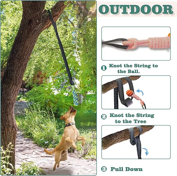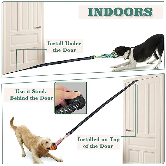 This is a great tug war rope dog toy for small/ medium/large dogs indoors or outdoors.The function of having an elastic band in the rope.So it's a bungee dog toy.Dog is playing tug-of-war when it's bored.This kit comes with a teething rope made of 100% cotton and a puzzle ball made of TRP!