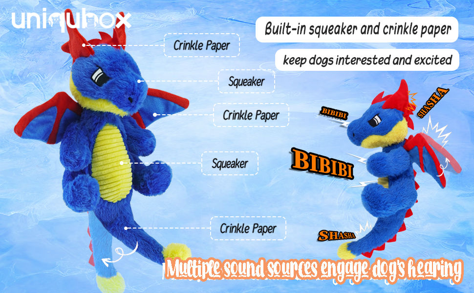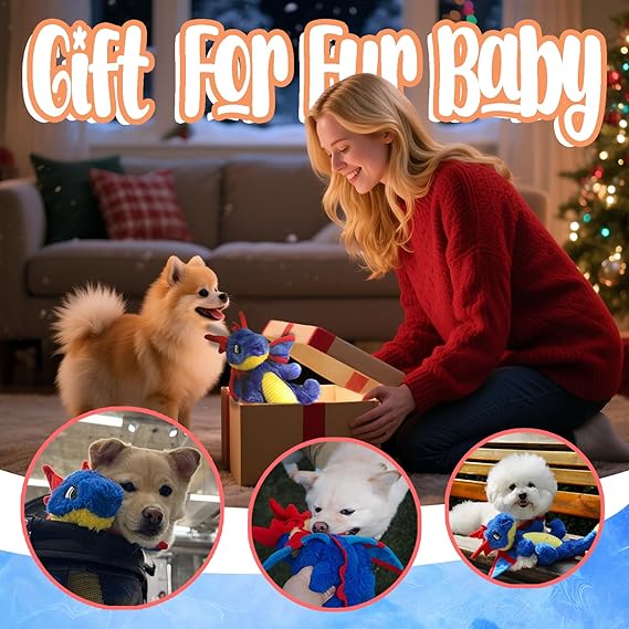 - 【Multi-Sensory Engagement】 Dual squeakers (head/belly) and embedded crinkle zones (horns/wings/tail) deliver auditory stimulation to trigger natural hunting instincts, which keeps pets engaged and entertained, reduces anxiety, and redirects destructive chewing. Wings with crinkle papers inside showcase meticulous craftsmanship for lasting excitement. Good small/medium/large dog toys or puppy toys to keep them busy
