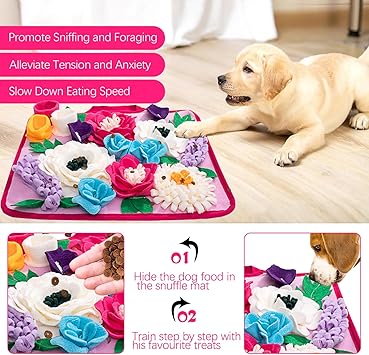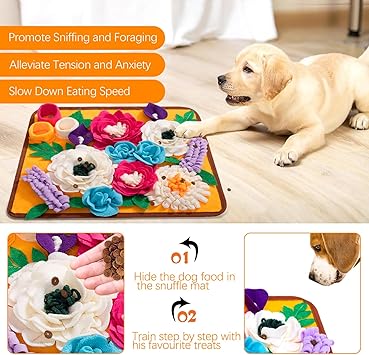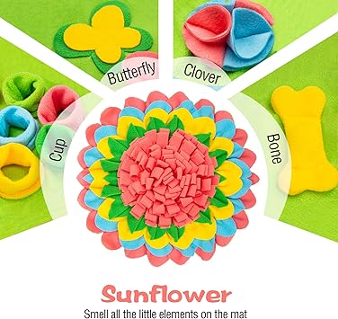 - 【Rich Interactive Game】Look at the big colorful flower in the middle of dog snuffle mat. A total of 4 layers of petals with different colors can easily hide large pieces of food. The dog digging mat has an abundant flower heart which is designed can cover small chunks of food without problems.
