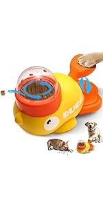 - Interactive Treat Dispensing: Press the duck's tail to activate the rotating food container, releasing treats randomly. This dog food puzzle feeder increases attention, reduces boredom, and promotes mental stimulation. While ideal for small and medium dogs, large dogs may need additional stability. Training required to help your dog activate the dispenser. This feature ensures longer engagement and an interactive mealtime experience.
