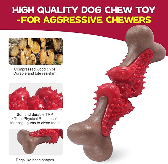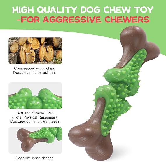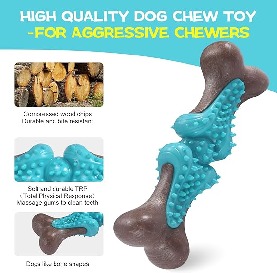 Durable Dog Chew Toys for Large Dogs - Tough Bone-Shaped Dental Chew with TPR Rubber & Wood Fiber, Teething & Aggressive Chewer Toys for Medium/Large Breed, Long-Lasting Teeth Cleaning & Stimulation