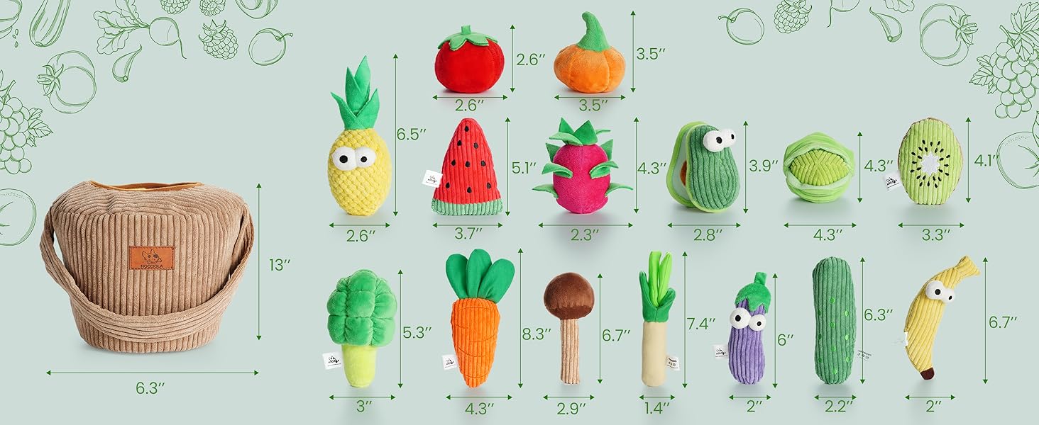 - Convenient Multi-pack and Size: Comes with a 13” grocery bag, it is perfect for storing puppy toys and taking them out to play. The fruit and vegetable toys come in sizes ranging from 3.5" to 8.3", which are suitable dog toys for puppy, small dogs and medium size dogs, but not recommended for large aggressive chewers