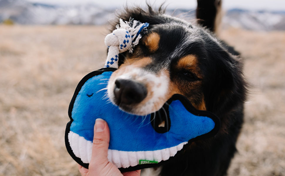 Only Natural Pet Sea Creatures Recycled Plush Dog Toys - Durable Double-Stitched Design with Internal Squeaker, Rope Tug Blow Hole & Ribbed Belly - Squeaky Pet Toy | Winston The Whale, 8.5" x 7.5"