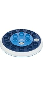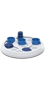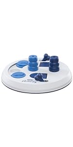 Dogs are very playful and intelligent animals. Channel their energy and curiosity into something positive with trixie's flip board. It is ideal for the intermediate canine gamer. The game rewards your pet for correctly opening the various compartments. To begin, place your dog's favorite treats in any or all of the compartments. By correctly sliding the covers or lifting the flaps and cones, the rewards will be revealed for your dog's enjoyment. Due to our unique design, the cones cannot be knocked over. They must be lifted straight up to be removed. Vary the number and placement of treats to increase the level of difficulty. The non-slip rubber rim keep the game in place as your dog explores. We have also included an instructional booklet with tips and tricks for challenging and training dogs of all ages through play. Dishwasher safe. Measurements 9 by 9 by 1 inch. Weight 1-pound.
