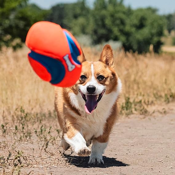 Pet parents can bring their love of the game to their backyard with the Chuckit! Fumble Fetch toy. The iconic football shape can be passed or punted for fun fetch games. The toy bounces in random directions each time for an exciting and surprising chase. Featuring a deep-ridged, grooved design, our fetch toy is easy for dogs to catch and carry. The ball's durable rubber, EVA foam, and polyester material are puncture-resistant for long-term play. Its vibrant, eye-catching colors ensure easy spotting from a distance, while the buoyant design keeps it afloat for exciting adventures at the pool, lake, or beach.