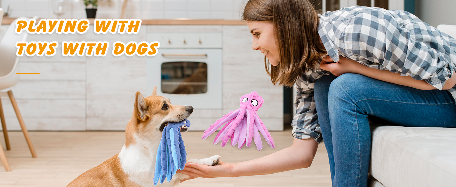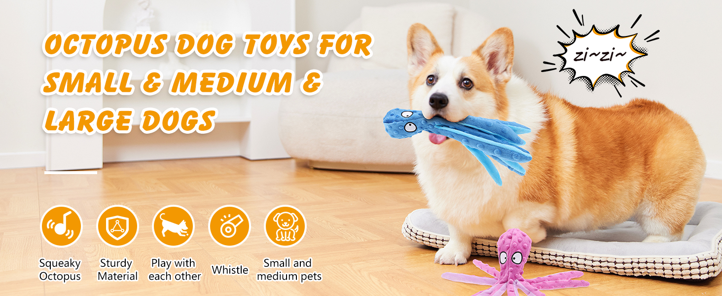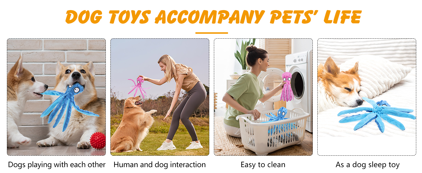 - 【Squeaky Dog Toy】: Pressing the head of the octopus plush dog toy will make a sound; the 6 feet of the octopus shape have wrinkled paper, which will make a sound when pressed. The squeak can attract the dog's attention and can interact with the dog.