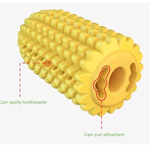 - Keep it Healthy: puppy teething toys, these natural rubber products fully protect them at this time, as biting can cause dental problems. The bristles on the corn are neatly aligned. Dog toothpaste can be squeezed into the grooves of the dog toothbrush stick. It effectively cleans teeth and controls the growth of tartar and plaque as your dog chews on tough dog toys!