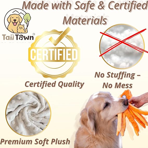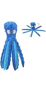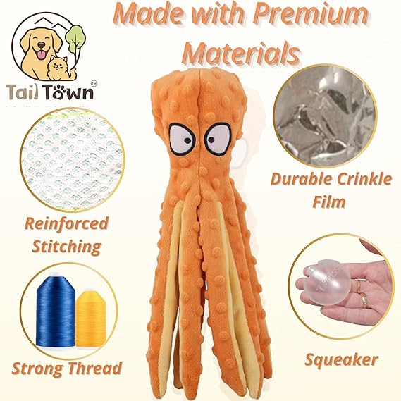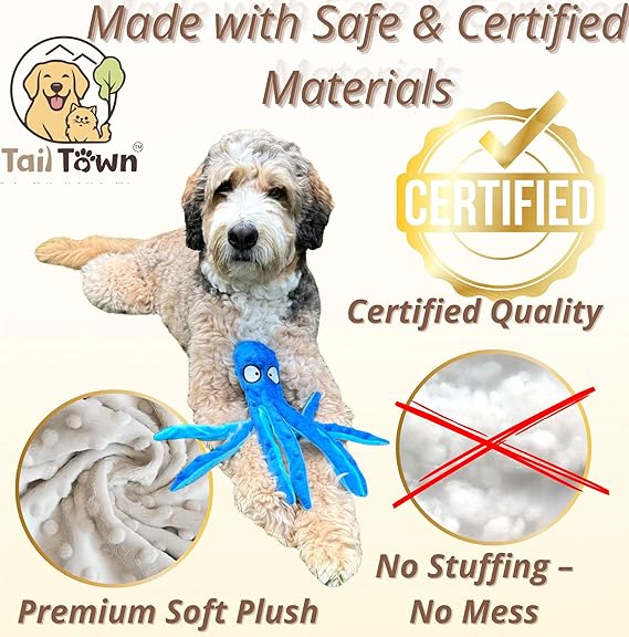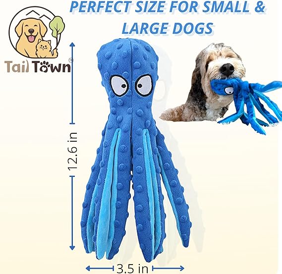 Octopus Dog Toy - Squeaky & Crinkle Plush - Durable No Stuffing Chew Toy for Small, Medium & Large Dogs - Interactive Pet-Safe Soft Toy for Tug, Fetch & Play - Blue- Tail Town