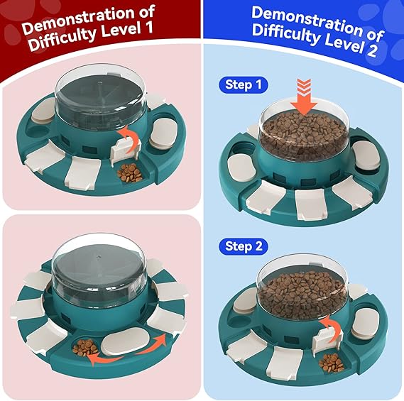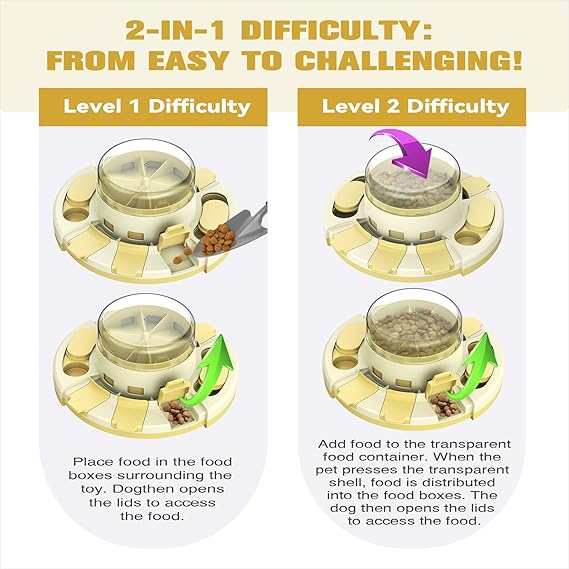 - [Instructions for Use] Level 2 Difficulty: Step 1: Your dog needs to press the transparent top cover of the toy using its paw. This action distributes food into six treat compartments within the toy. Step 2: The dog can open the lids of the treat compartments with its nose to access the food rewards. This process engages both the mind and body, enhancing your dog’s intelligence and supporting brain development.