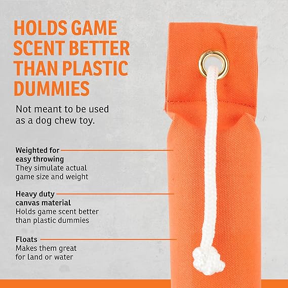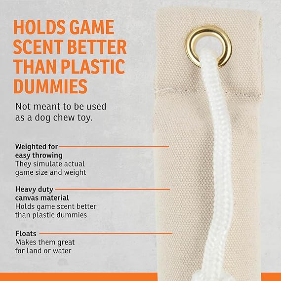 SportDOG Canvas Dummies are purpose-built for serious hunters and trainers who want to condition their dogs for real fieldwork. Designed to simulate the size, weight, and scent of actual game, these starter hunting dummies provide the control and realism needed to turn drills into field-ready results. Constructed with rugged canvas, each dummy is built to take a beating from high-drive dogs without breaking down after a few sessions. The canvas shell readily holds game scent, turning each throw into a practical scent drill for sharper, more focused retrieval. Whether you’re preparing for upland, waterfowl, or general field use, this game scent absorber ensures dogs associate the scent with successful returns. The dummies are weighted, helping you train on accuracy and distance. This long-range throw dummy design means handlers can replicate real hunting throws with consistency, helping dogs learn how to mark and retrieve on both land and water. Buoyancy allows for floating action during water retrieves. Since 2003, SportDOG has been the trusted name for hunters, trainers, and outdoor dog owners who need gear that works as hard as their dogs do. Every product is built for rugged conditions and tested by real handlers in the field—not in labs. With a no-fluff approach, expert-developed training resources, and U.S.-based customer care, SportDOG delivers the clarity, control, and durability serious users demand. Whether you're hunting upland game or exploring off-leash, SportDOG gives you the confidence to train, contain, and communicate with your dog—no matter where the trail leads.