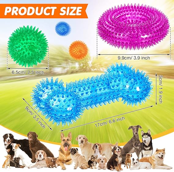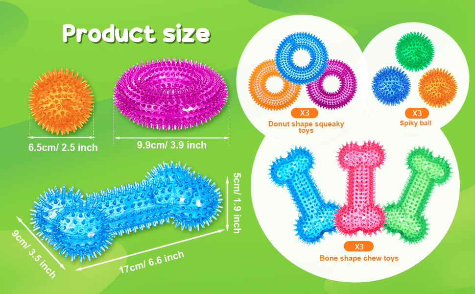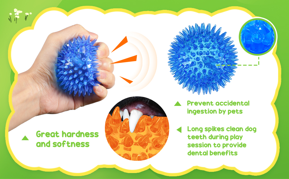 - Teething and Training: spiky texture on the squeaky dog toys can help dogs to improve teeth health through chewing; Designed with an inner squeak, the dog teething toys can make dogs love chewing and playing