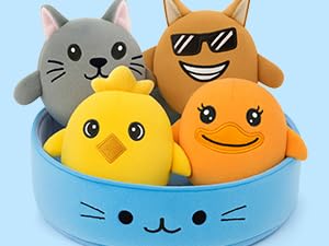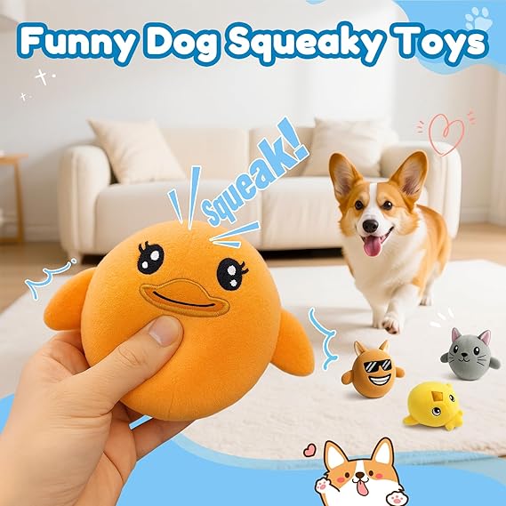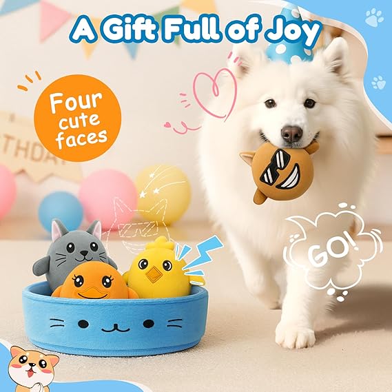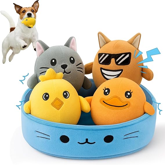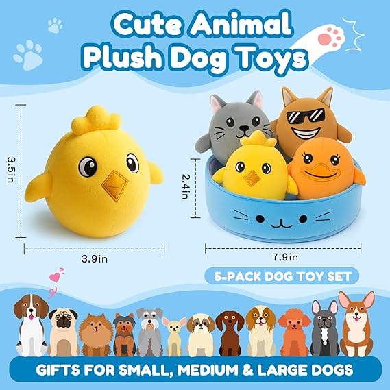 - 5-Pack Adorable Dog Toy Set: Meet your pup's new plush pals! This squeaky dog toy set comes with four cute critters — pup, kitty, chick, and duck — plus a soft little plush basket. These dog toys plush are designed with vivid animal shapes and bright colors are designed to attract your dog's interest