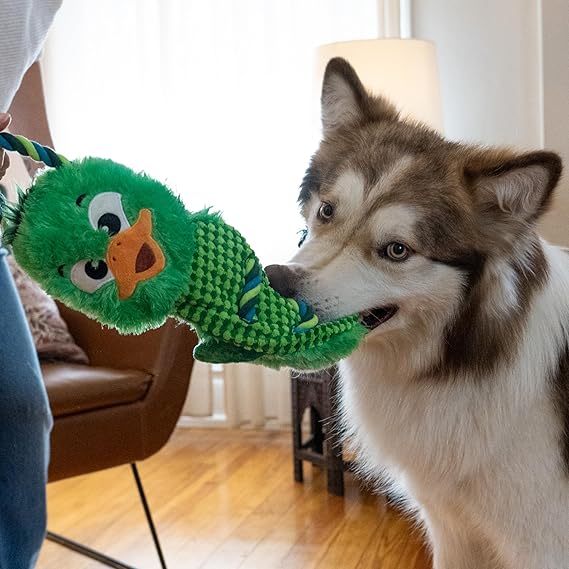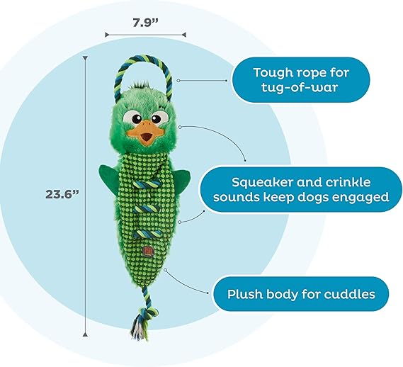 Outward Hound Ropiez are cute, yet tough interactive dog toys that are ideal for tug-of-war and fetching. Constructed with soft plush and twisted rope material, Ropiez are built to last. Crinkle noises and squeaks help keep even the friskiest dogs focused on playtime-because it's serious business after all. Grab the rope loops for a fun game of tug-of-war or toss these floppy dog toys for your pup to fetch. Available in multiple characters to fit your pup's personality. Note, these are meant for interactive play and not to be used as a chew toy.