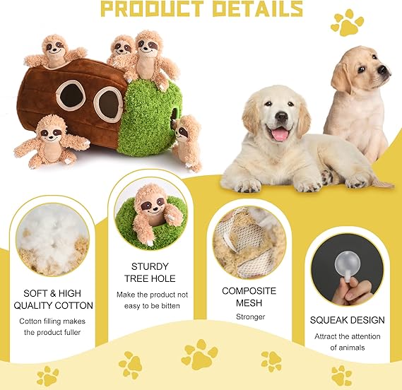 Interactive Squeaky Dog Toys Plush Sloth Dog Toy, Stuffing Woodland Friends Burrow, Squeaky Plush Dog Toy for Small Medium Large Dogs (Small)