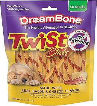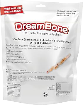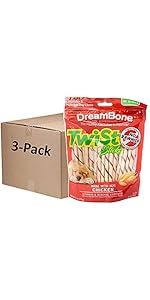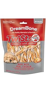 DreamBone® chews have all the benefits of a rawhide chew…without the rawhide! No-rawhide DreamBone chews are made with real chicken, beef, bacon and cheese or sweet potato and wholesome vegetables for a scrumptious taste dogs can’t resist! No-rawhide DreamBone® Twist Sticks for dogs are made with wholesome vegetables and real chicken and for a scrumptious taste dogs can’t resist! They have all the benefits of a rawhide chew - without the rawhide! These chew sticks are enriched with vitamins and minerals in a twist-shaped chew for dogs of all sizes - for an easy-to-digest treat that’s 100 percent delicious! Chewing helps maintain healthy teeth through the natural action of chewing, making DreamBone Twist Sticks a chew both you and your dog can love! Give your dog one to two DreamBone Twist Sticks chews per day. For supervised consumption only. This product is intended for intermittent or supplemental feeding only. Store in a cool, dry place. After opening this resealable bag, reseal or store in an airtight container to preserve freshness.