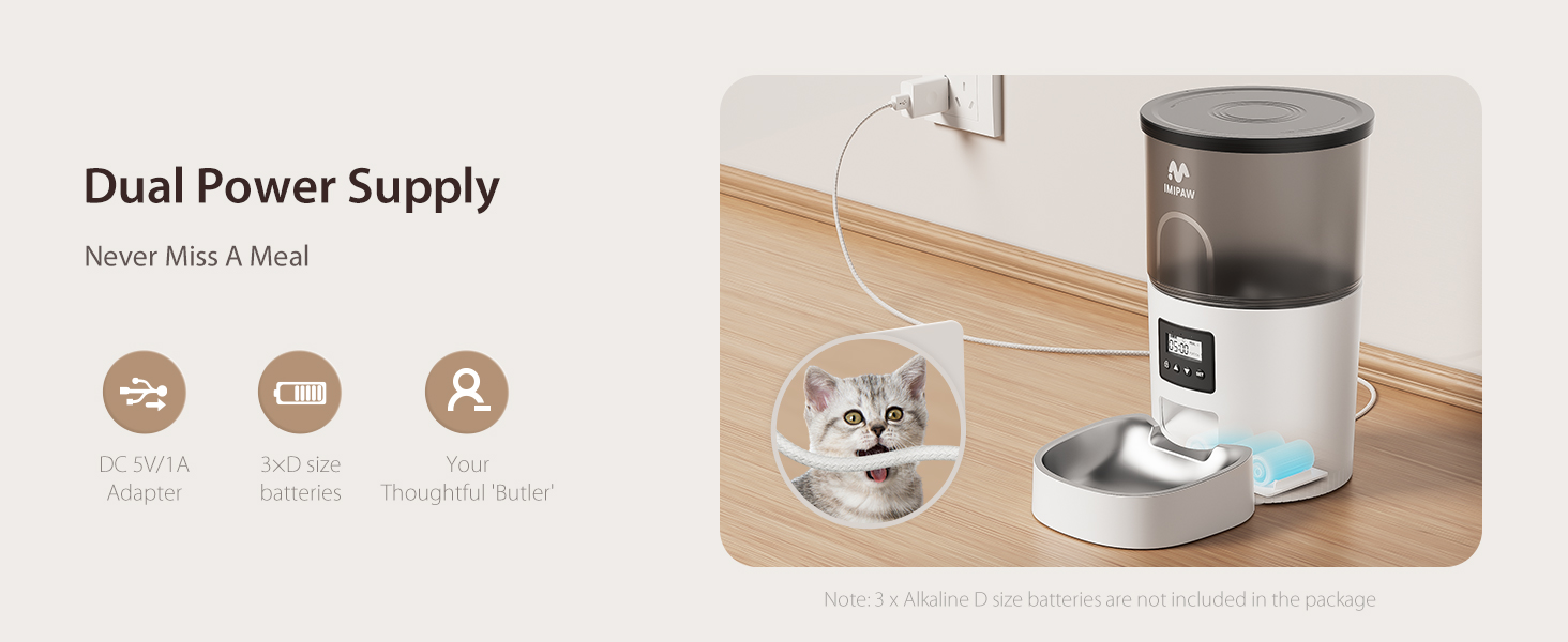 - Dual Power Supply & Anti-Clogging Design. 5V DC adapter + 3 alkaline D-cell batteries (NOT INCLUDED), our automatic pet feeder for medium and small pets adopted the latest power system to prevent power outages, thus ensuring a constant food supply for your beloved pets