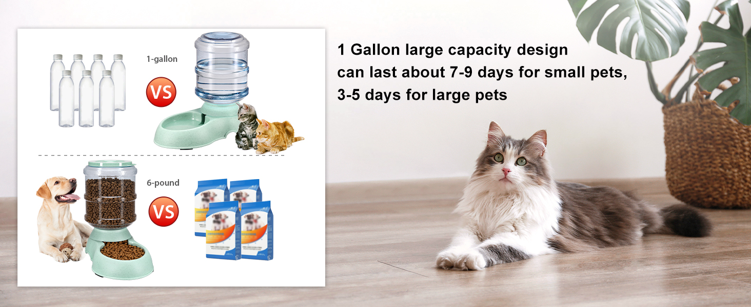 - CAT FEEDER AND WATER DISPENSER: 1*Feeder, 1*Water dispenser, Size of each pet feeder: 12×7×12 inches.Capacity: 1 Gallon*2 ,can hold about 6 pound food and about 3.8L water. Make your pet enjoy fresh food and clean water