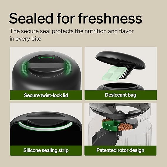 - Freshness in Every Bite: Patent rotor in the tank base and twist-lock lid of the automatic pet feeder prevent pets sneaking into the food dispenser for extra food. Built-in desiccant bag and sealing strip keep food fresh and crunchy. Food-grade stainless steel bowl provides healthy and hygienic feeding, saving your pets from chin acne.