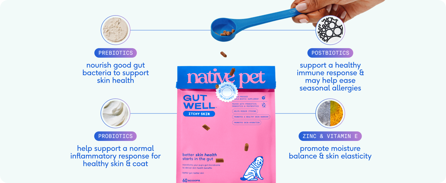 - SKIN-SUPPORTING TRIPLE-BIOTICS FOR REAL RESULTS: Our targeted pre, pro, and postbiotics work together to promote a normal inflammatory response, nourish the gut, and provide dog allergies and itching relief, the best itchy skin relief for dogs with seasonal sensitivities.