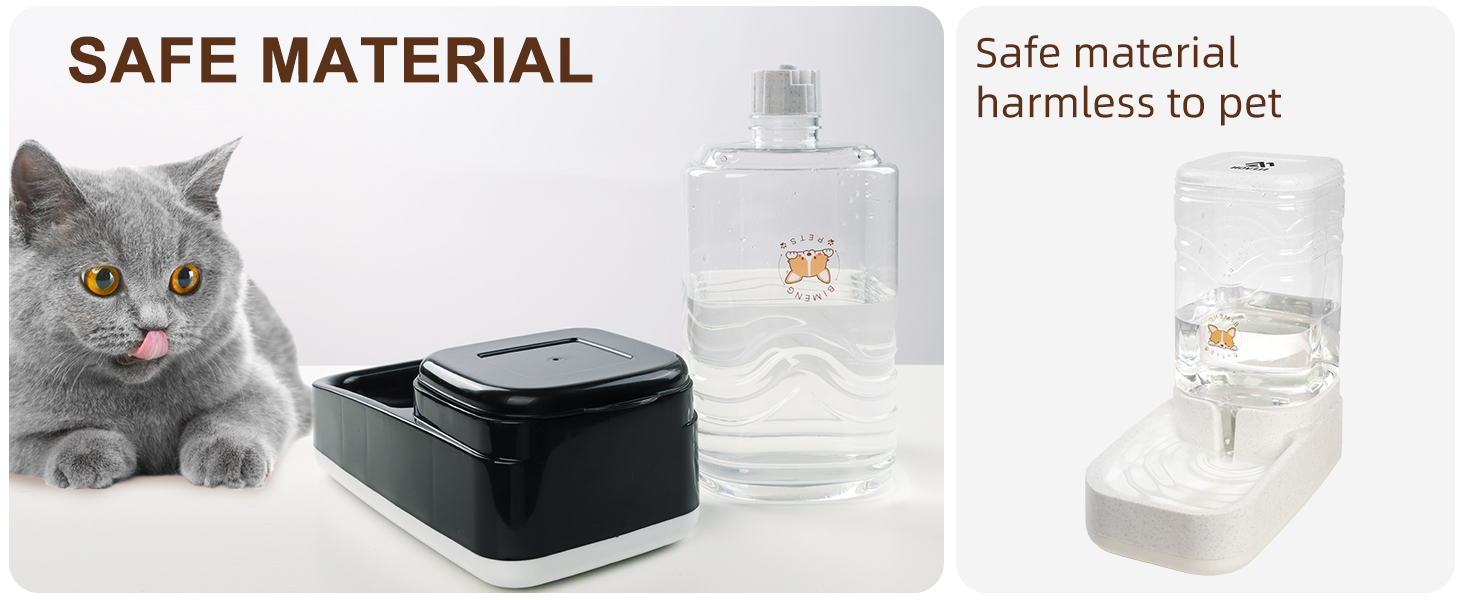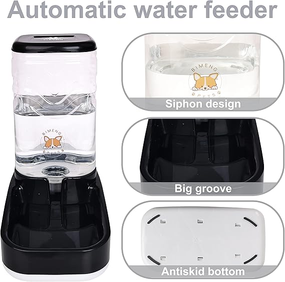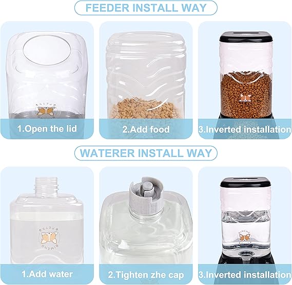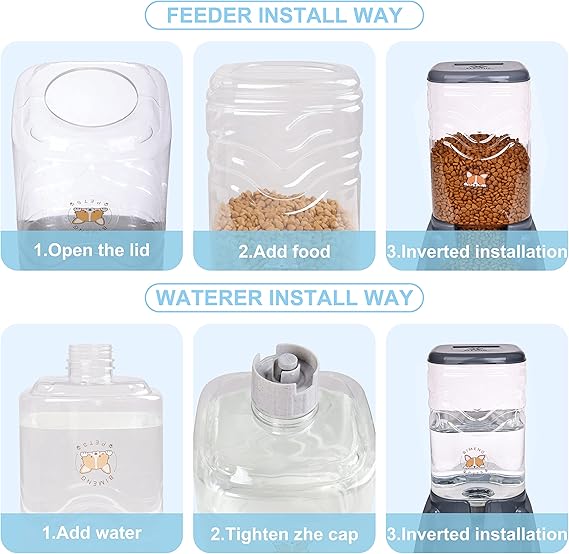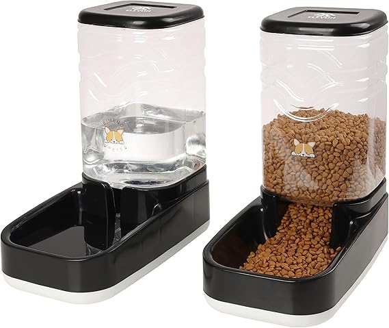 Automatic pet feeder utilizes gravity to automatically supply water and food. Simple design, no electricity required