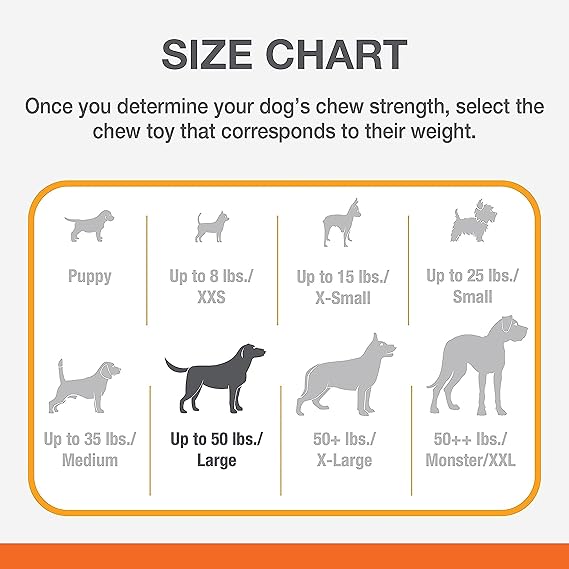 Dogs 50 lbs - X-Large/Souper and Monster & Big Chews. Products to try: Galileo, Romp N Chomp, Big Chews for Big Dogs