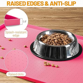 - EXTRA-TALL LIP PREVENTS SPILLS: Super high outer lip (1.0” raised edge) keeps all the mess contained on the doggie placemat and away from your floor. Anti skid surface prevents dog bowls from moving. Use this cute waterproof mat under pet food bowls for dogs, water dishes, pet fountains, automatic feeders, feeding stations to protect your floors.