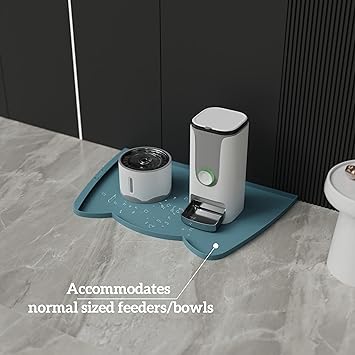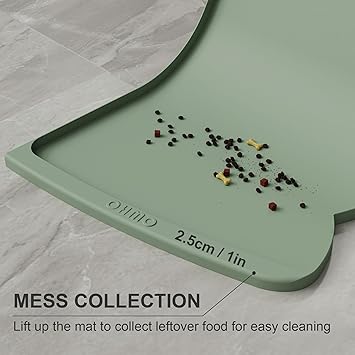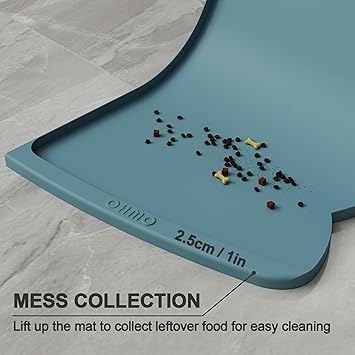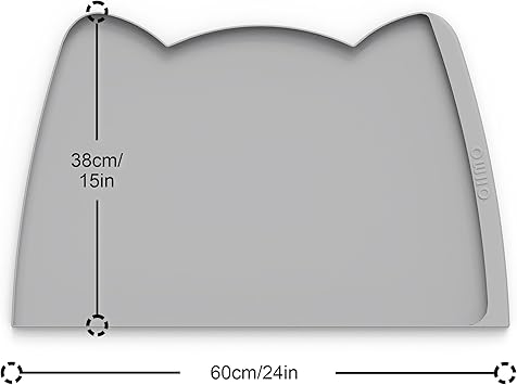 Dimensions: 24"x15"x0.6" (raised edges) Pet Feeder/Pet Food place mat with Residue Collection Pocket, Unique sleek, stylish design Dish-Washer friendly, easy to clean Anti-spill raised high edges to contain food and water Waterproof for protection Anti-slip design for secure placement. Flexible silicone material for easy storage and cleaning
