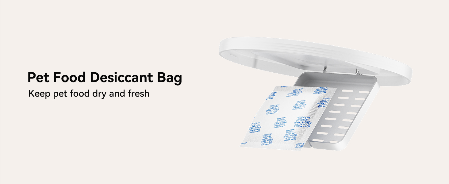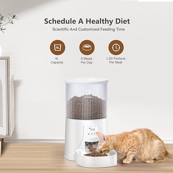 - Safe and Reliable Feeder: The automatic pet feeder has a desiccant bag and secure lock lid to keep food fresh and prevent pets from accessing stored food; 4L large capacity≈ 16 cups; 1 cup≈ 16 portions; 1 portion≈ 1tbsp≈ 6g