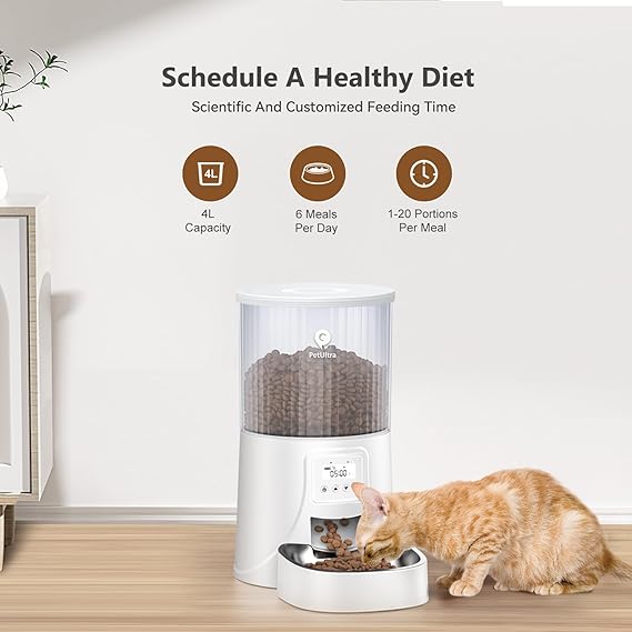 - Timer Programmable: Automatic cat feeder dispenses food precisely at the scheduled time with no delays; allows up to 6 meals daily and up to 20 portions per meal; customizes feeding frequency based on your pet's habits; whether you're at work or on vacation, our automatic pet feeder ensures your pet never misses a meal