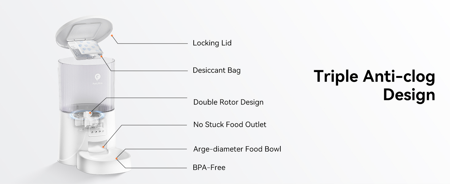 - Anti-Clogging Design: Double rotor design ensures even food distribution; food passage features a wide-angle and 40-degree slope to speed up grain flow; recommended for dry kibble sizes between 0.07 to 0.4 inches