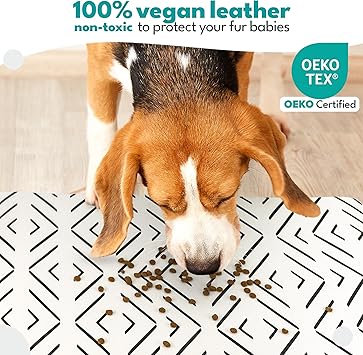 - PREMIUM VEGAN LEATHER & NON-TOXIC MATERIALS - Upgrade from cheap dog bowl mats to our top-quality vegan leather dog food mat. Made from OEKO-certified, non-toxic, recyclable materials, this pet feeding mat offers a stylish, eco-friendly solution for dog and cat bowls without sacrificing durability or safety.