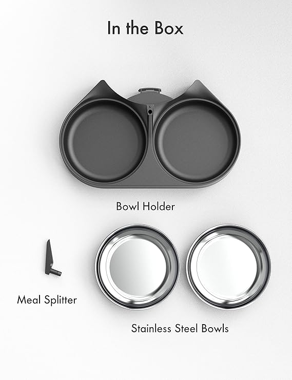 - Easily Feed Two Pets: If you have two cats or dogs, this 2-pet diner set is the right choice for feeding two pets simultaneously. In the box: a meal splitter, two stainless steel bowls, bowl holder.