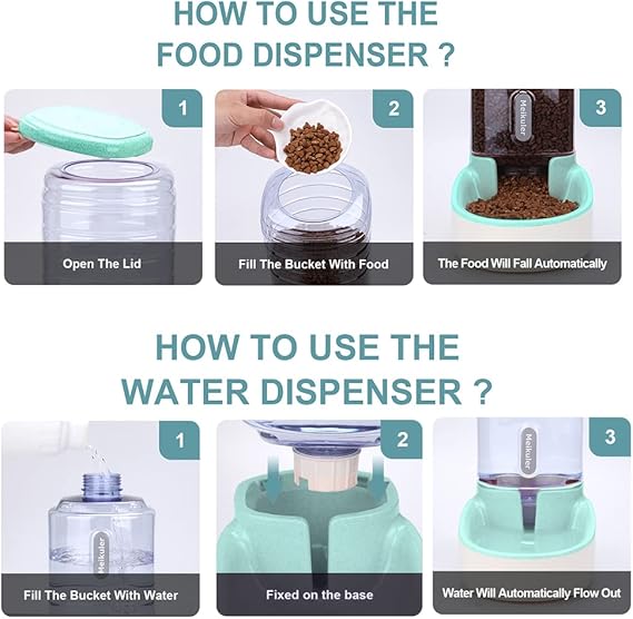 - Automatic food feeder and water dispenser set: This gravity-operated food feeder ensures a continuous food supply for your pet without worrying about them going hungry; The water dispenser adopts spiral and spring valve design to ensure that it never leaks. With a transparent storage bottle, you can refill it in time when the food and water are used up.