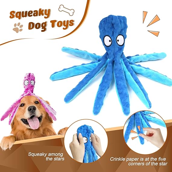 - Squeaky & Crinkle Dog Toys: These octopus dog squeaky toys with exquisite cartoon octopus image, the two eyes of octopus are delicate embroidery, and the 8 paws of them can be opened or closed.These funny squeak dog toys will be great toys to interact with your dog, help to get more exercise, reduce anxiety and boredom