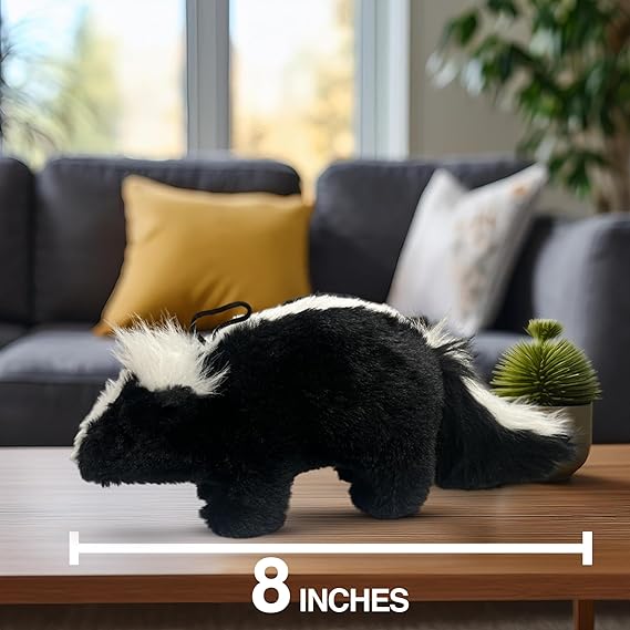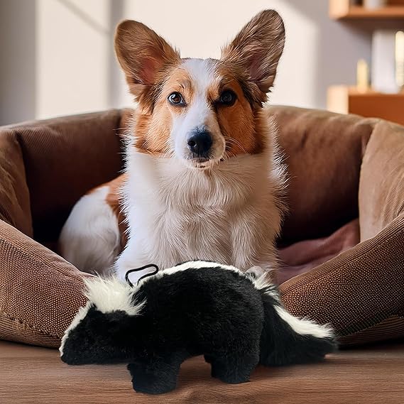 Bring the outdoors inside with this adorable 8-inch plush skunk dog toy that's ready to become your pup's new favorite companion. This realistic black and white stuffed animal features built-in squeakers that engage your dog's natural instincts and keep them entertained during playtime. The interactive design encourages healthy play while providing mental stimulation for your furry friend. Perfect for fetch, tug-of-war, or simple cuddle sessions, this plush skunk is sized just right for small to medium dogs. The squeaky feature adds an extra element of excitement that dogs love, making it an excellent choice for interactive play sessions. Whether your dog likes to chase, shake, or snuggle with their toys, this charming skunk is sure to deliver hours of entertainment. Keep your pet active and engaged with this delightful stuffed toy that combines the appeal of a plush animal with the excitement of a squeaker.